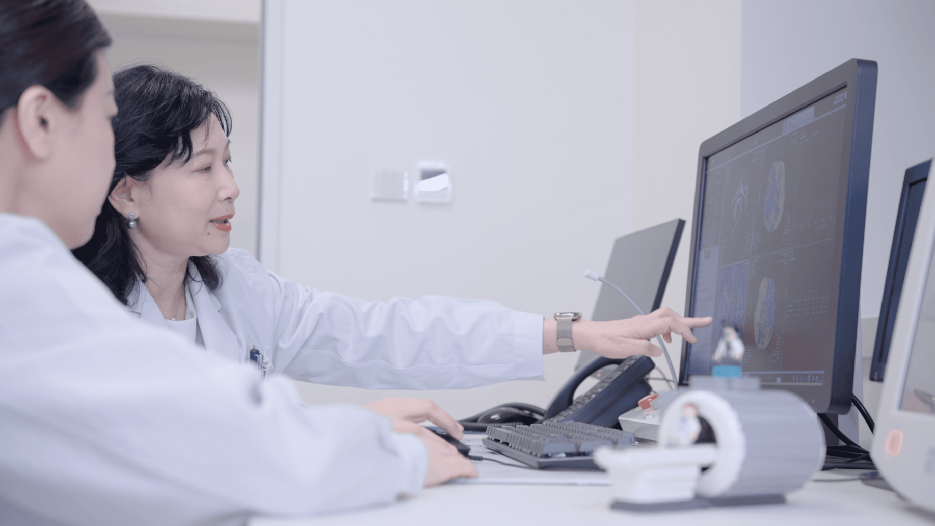 知名专家基于5T影像研讨病例:上图为北京协和医院放射科主任冯逢教授与副主任王怡宁教授,下图为复旦大学附属中山医院放射科主任曾蒙苏教授